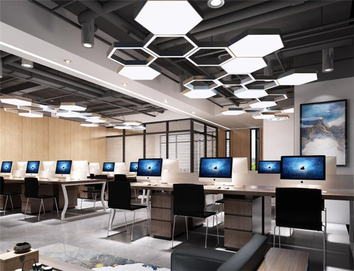 3、整體空間以現(xiàn)代科技感為主,運用線條燈來營造空間的整體氛圍,提升科技感的體驗,在局部用活躍的顏色來跳動整個空間的色彩,形成不一樣的風(fēng)格。會議室設(shè)計裝修使用簡潔明了的軟膜天花,給予整個空間的光線之外,形成了自己獨特的裝飾作用。員工辦公室設(shè)計用六邊形的蜂巢燈具來打亂整個空間的死板性,讓整個空間更具有創(chuàng)新力。